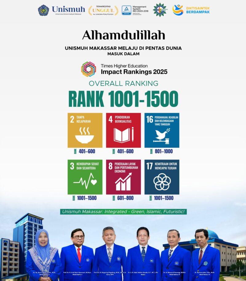 MAKASSAR, SULAWESI SELATAN (Kabar PROFESIANA.co.id) — Universitas Muhammadiyah (Unismuh) Makassar kembali mencatatkan capaian membanggakan di kancah pendidikan tinggi global. Dalam pemeringkatan Times Higher Education (THE) University Impact Rankings 2025, Unismuh menjadi satu-satunya perguruan tinggi swasta di kawasan Indonesia Timur yang masuk dalam daftar prestisius tersebut.