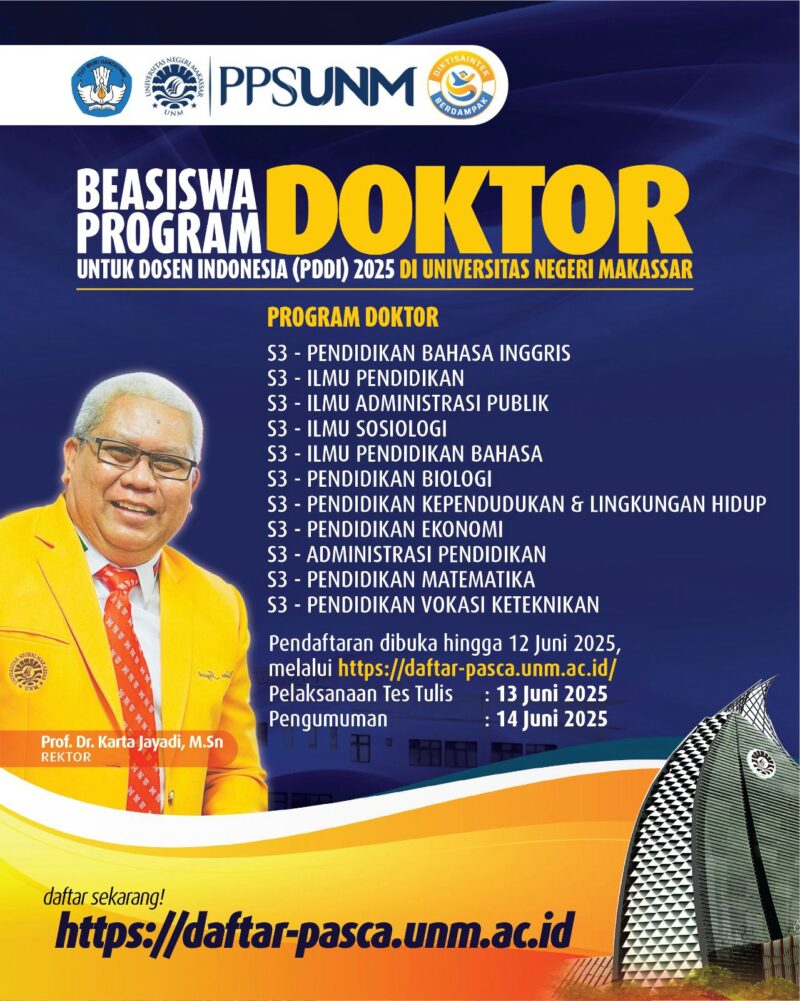KabarPROFESIANA.co.id – Makassar. Berdasarkan informasi dari laman beasiswa.kemdiktisaintek.go.id. telah tertera semua program studi untuk jenjang program doktor (S3) di Program Pascasarjana Universitas Negeri Makassar (PPS UNM) dapat mendaftar sebagai calon penerima beasiswa Program Doktor untuk Dosen Indonesia (PDDI) S3 tahun 2025.