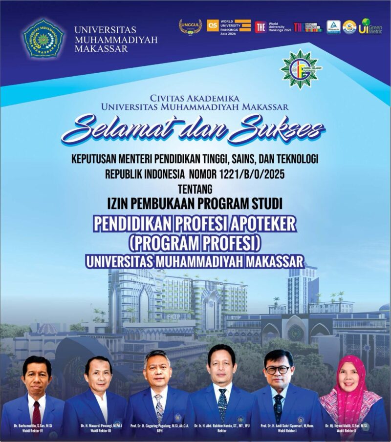 MAKASSAR, SULAWESI SELATAN (Kabar PROFESIANA.co.id) — Universitas Muhammadiyah (Unismuh) Makassar resmi memperoleh izin pembukaan Program Studi Pendidikan Profesi Apoteker (PSPA) Program Profesi. Izin tersebut tertuang dalam Keputusan Menteri Pendidikan Tinggi, Sains, dan Teknologi (Kemdiktisaintek) Nomor 1221/B/O/2025 yang ditetapkan di Jakarta pada 30 Desember 2025.