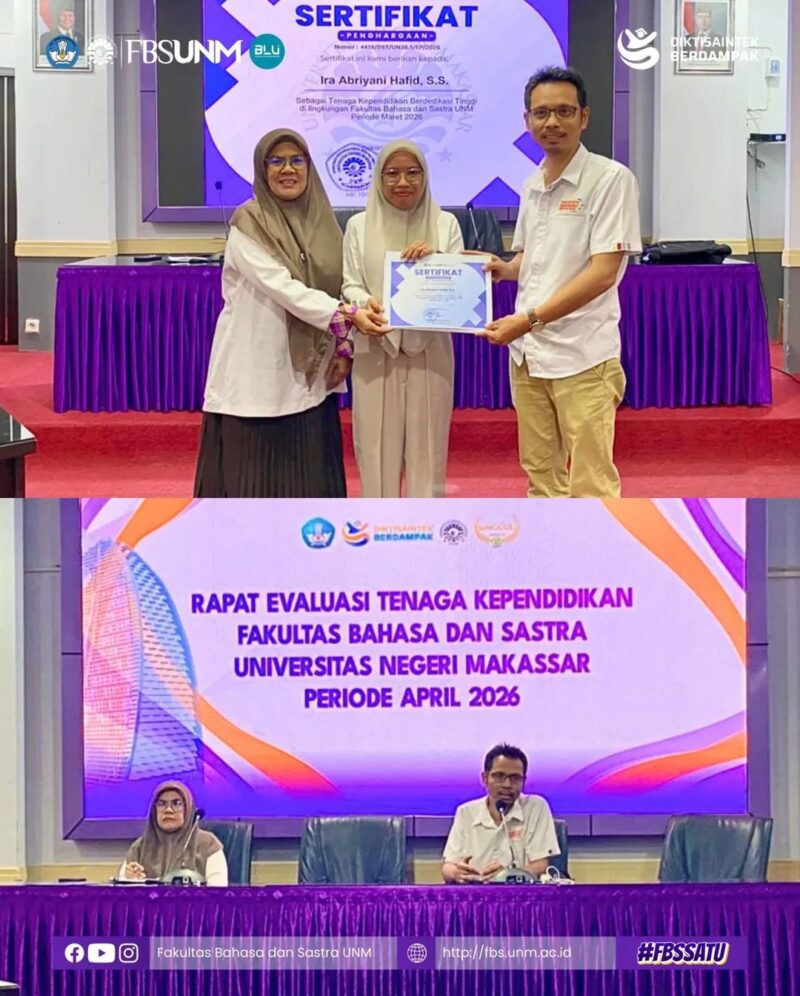 Momentum ini juga menjadi ajang apresiasi bagi Tendik yang menunjukkan dedikasi tinggi dalam menjalankan tugasnya. Ira Abriyani Hafid, S.S., berhasil meraih penghargaan sebagai Tendik FBS UNM Berdedikasi Tinggi Periode April 2026. Penghargaan tersebut diberikan sebagai bentuk pengakuan atas konsistensi, tanggung jawab, dan kontribusi nyata dalam mendukung operasional fakultas.