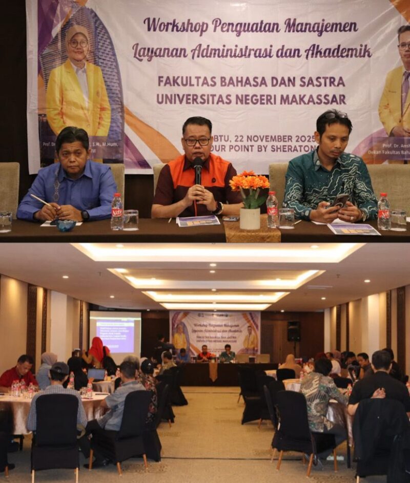 Penegasan itu disampaikan Dekan FBS UNM, Prof.Dr. Anshari, M.Hum. ketika memberi sambutan dan pengarahan dalam kegiatan Workshop Penguatan Manajemen Layanan Administrasi dan Akademik di FBS UNM pada Sabtu, 22 November 2025, di Four Points by Sheraton Hotel Makassar.