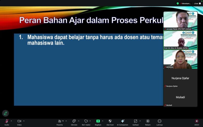 TERNATE, MALUKU UTARA (Kabar PROFESIANA.co.id) – Jurusan Pendidikan Ilmu Pengetahuan Sosial (IPS) Fakultas Keguruan dan Ilmu Pendidikan (FKIP) Universitas Khairun (Unkhair) Ternate sukses menyelenggarakan Webinar Nasional bertajuk “Inovasi Integrasi Teknologi dan Pedagogi dalam Pengembangan Bahan Ajar” pada Sabtu (20/9/2025). Kegiatan ini digelar secara daring melalui ruang virtual Zoom Cloud Meeting dan diikuti oleh ratusan peserta dari berbagai daerah di Indonesia.