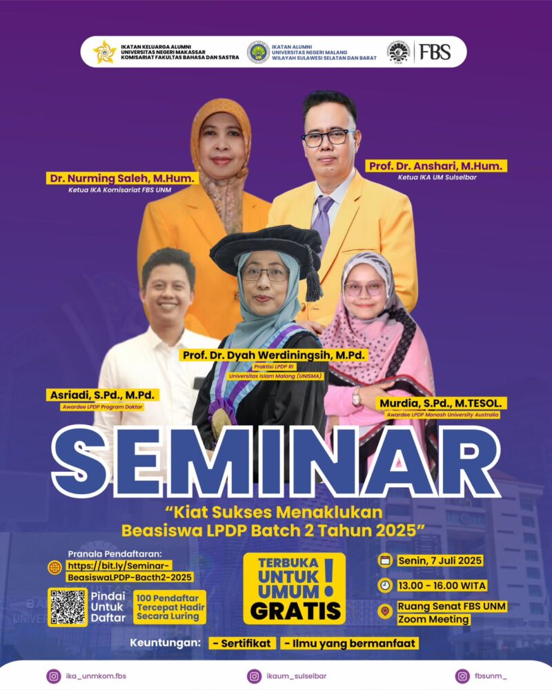 Kolaborasi IKA UM Sulselbar, IKA FBS, dan FBS Adakan Seminar Kiat Sukses Menaklukkan Beasiswa LPDP Batch 2 Tahun 2025, Terbuka untuk Umum, Gratis, dan Sertifikat