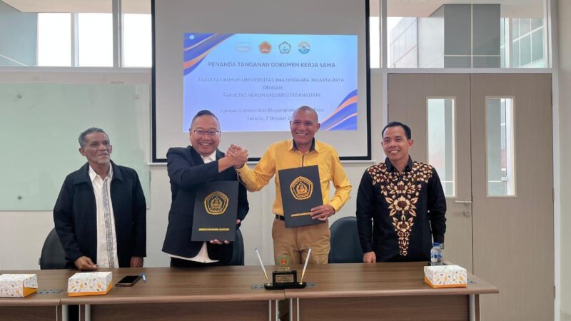JAKARTA (Kabar PROFESIANA.co.id) — Fakultas Hukum Universitas Khairun (FH Unkhair) Ternate dan Fakultas Hukum Universitas Bhayangkara (FH UBHARA) Jakarta Raya secara resmi menjalin kerja sama akademik melalui penandatanganan Perjanjian Kerja Sama (PKS) yang dilaksanakan pada Selasa, 7 Oktober 2025, bertempat di Kampus II Universitas Bhayangkara Jakarta, Jakarta Selatan.
