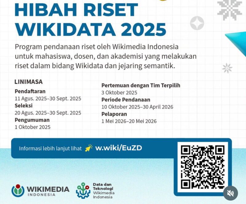 MAKASSAR, SULAWESI SELATAN (Kabar PROFESIANA.co.id) — Wikimedia Indonesia membuka pendaftaran seleksi Hibah Riset Wikidata Tahun 2025 yang memberikan pendanaan untuk riset yang fokus pada pengembangan Wikidata, Wikipedia, dan Data Terbuka Terhubung (Linked Open Data) di Indonesia.