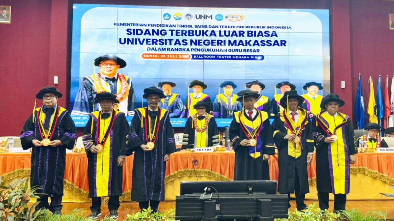 MAKASSAR, SULAWESI SELATAN (Kabar PROFESIANA.co.id) — Rektor Universitas Negeri Makassar (UNM), Prof Dr Karta Jayadi secara resmi mengukuhkan enam orang guru besar dari Fakultas Bahasa dan Sastra (FBS) UNM, di Ruang Teater lantai 2 Menara Pinisi, Senin (28/7/2025).