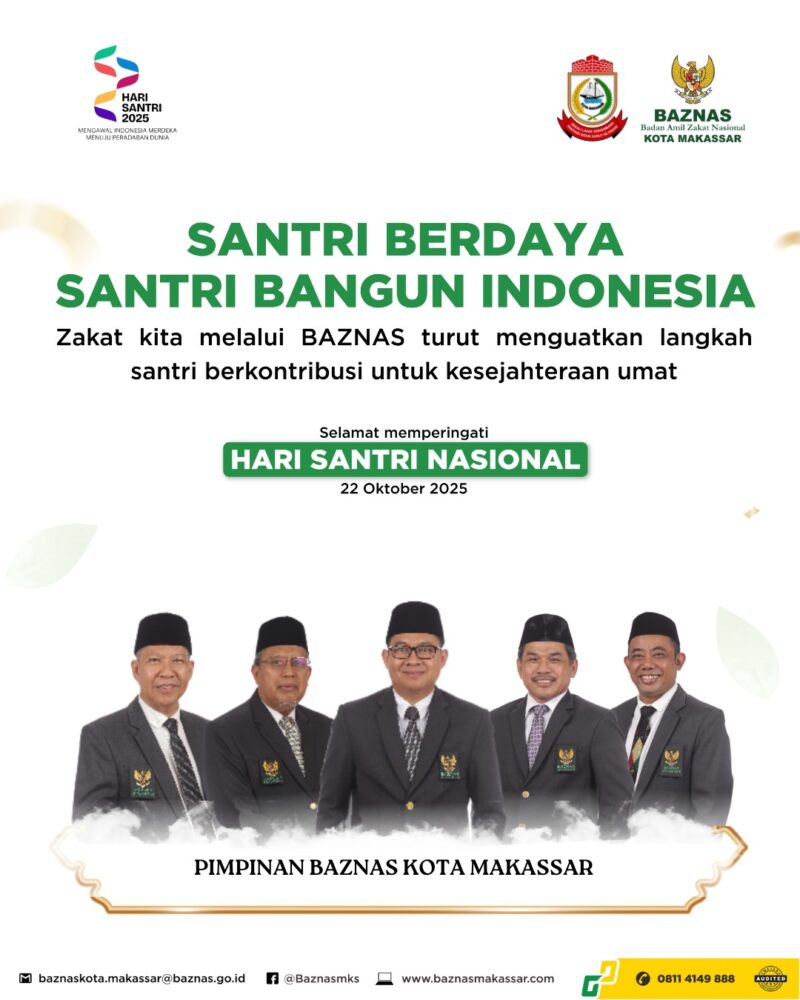 Badan Amil Zakat Nasional (BAZNAS) Kota Makassar pun tidak ketinggalan menyampaikan Selamat Hari Santri Nasional, 22 Oktober 2025. Untuk lokal Sulawesi Selatan, Hari Santri digelar di pelataran Masjid Al-Markaz Makassar.