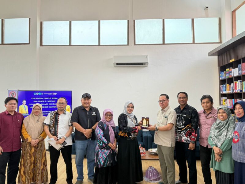 MAKASSAR, SULAWESI SELATAN (Kabar PROFESIANA.co.id) — Sebanyak 70 siswa SMA Negeri 2 Parepare yang didampingi kepala sekolah dan guru-guru melakukan kunjungan kampus di Fakultas Bahasa dan Sastra (FBS) Universitas Negeri Makassar (UNM), Kamis (9/10/2025). Rombongan disambut langsung oleh Dekan FBS UNM, Prof. Anshari, di Perpustakaan FBS.