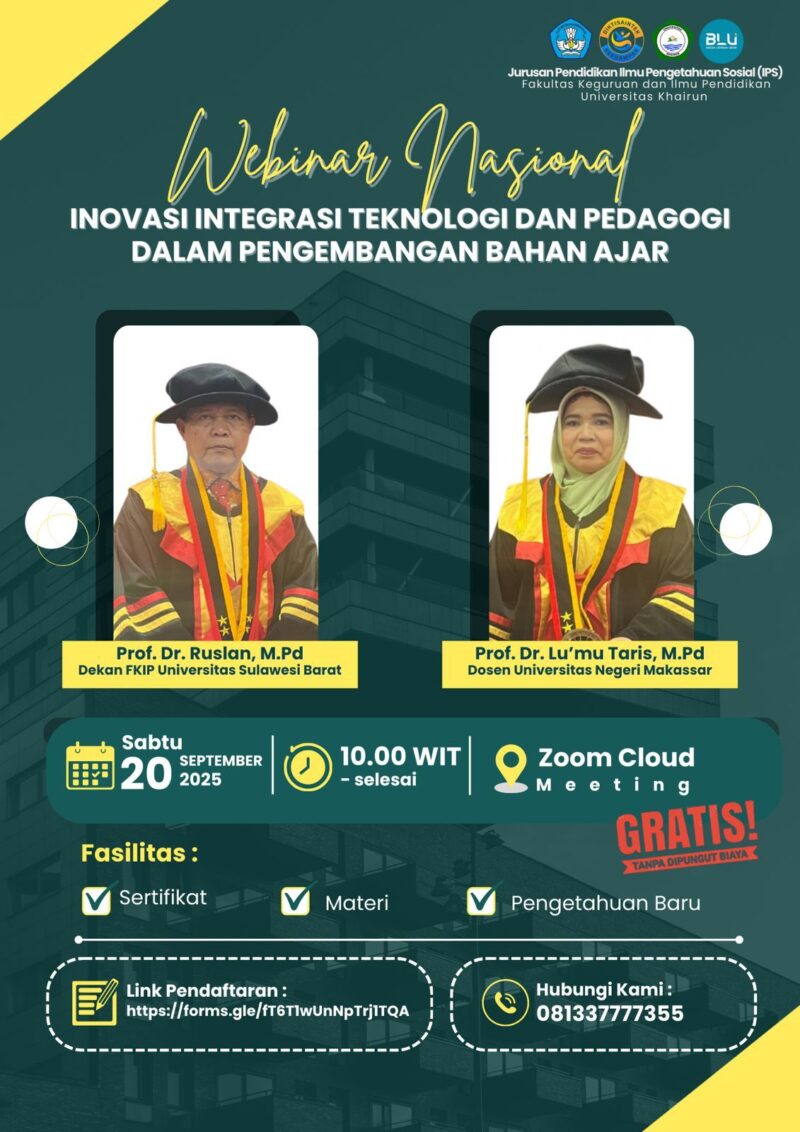 TERNATE, MALUKU UTARA (Kabar PROFESIANA.co.id) – Jurusan Pendidikan Ilmu Pengetahuan Sosial (IPS) Fakultas Keguruan dan Ilmu Pendidikan (FKIP) Universitas Khairun (Unkhair) Ternate akan menyelenggarakan Webinar Nasional dengan tema “Inovasi Integrasi Teknologi dan Pedagogi dalam Pengembangan Bahan Ajar” pada Sabtu, 20 September 2025, pukul 10.00 WIT melalui aplikasi Zoom Cloud Meeting.